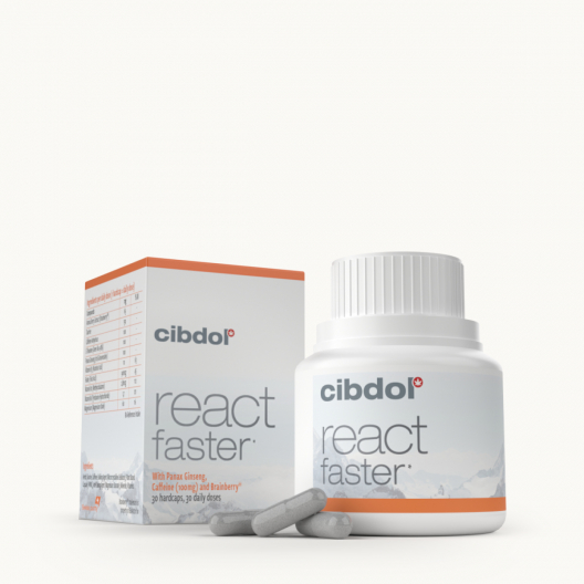 Votre temps de réaction peut faire la différence entre gagner et perdre. C'est parfois l'affaire d'une fraction de seconde. React Faster de Cibdol vous y aidera. Ce produit contient des vitamines essentielles, des minéraux, du Brainberry® de Bioactor, de la caféine et une combinaison unique de taurine, de thé vert et de Panax ginseng. Avec lui, votre corps peut relever tous les défis.*